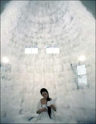 Ce qui naît des gestes répétitifs de Sachiko Abe est un environnement d’une délicate et fragile beauté. Elle semble émerger d’un nuage ou être la source inépuisable d’une coulée vaporeuse qui envahit l’espace dans un silence paisible dont la durée est ponctuée du bruit amplifié de ses ciseaux donnant la mesure du temps.