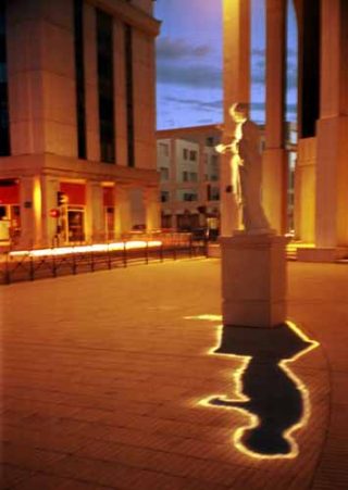 — Sculpture, place Zeus, Montpellier 2001, série «Urban Shadows», 2006. Photographie couleur contre-collée sur aluminium. 66,5 x 100 cm.
