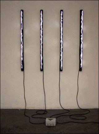 — Graffiti Illumination, 2005. Scratching sur 4 néons blancs, peinture routière noire.