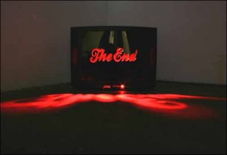 — The End, 2006. Sculpture vidéo. Peinture routière noire, micro billes de verre sur lettrages en Best Top, projection vidéo sur lettrage découpé, téléviseur factice 67 cm. 79 x 2 x 226 cm (lettrages).