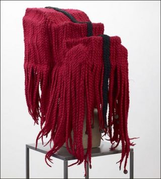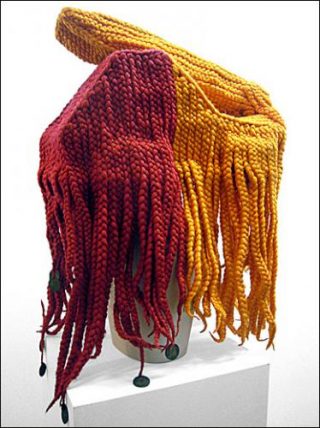 — Meschac Gaba, Fire Truck (Série Perruques voitures), 2008. Cheveux artificiels tressés, pièces en métal, buste de mannequin. 78 x 50 x 30 cm