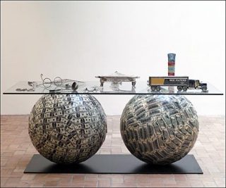 En dernier lieu, Archéologie contemporaine expose sur des tables en verre soutenues par deux globes recouverts de faux billets, des objets rouillés, usés et déglingués issus de notre quotidien, et vise par là à interroger le concept d’authenticité. Effectivement, ces objets paraissant d’un autre âge ont en réalité été collectés chez des habitants de Saint Louis, aux États-Unis, et ont aussitôt été enterrés pendant un an.