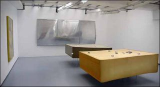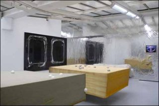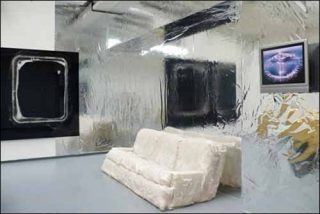 Placé sur le mur du fond, en vis-à -vis de l’exposition, le panneau en aluminium recueille et reflète toutes ces réalités travesties: ne serait-on pas là devant la grotte de Platon, sur le seuil de la définition de l’art ?