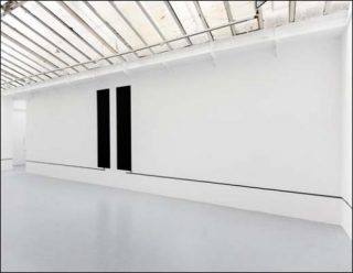 Enfin, l’œuvre présentée dans le bureau de la galerie est un clin d’œil aux Two Lines, motif intimement lié à l’œuvre de Peter Downsbrough. Cette fois, celles-ci sont associées au mot «the», déposé sur le bas du mur.
