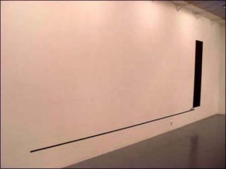 Close/Open (2010), certainement l’œuvre la plus troublante de l’exposition, qu’un manque de recul ne permet cependant pas d’appréhender comme il faudrait, s’ordonne autour d’un mince tube noir franchissant la salle verticalement. À ses extrémités, deux lignes parallèles tracent des ombres portées et dessinent avec lui les côtés d’un cadre dématérialisé. Par un jeu d’optique, l’œuvre rend sensible un plan en suspens, feuillet d’espace vide que viendraient clore ou étirer dans l’œil du spectateur deux autres lignes fixées aux murs.