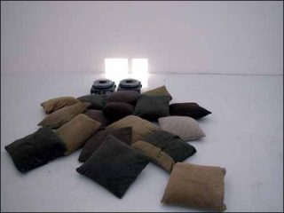 — Travelogue Lecture (with missing content), 2003. Installation avec double projections de diapositives, 17 coussins marrons en velours côtelé. Dimensions variables.