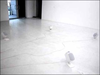 Il faut toutefois noter que les haut-parleurs, en tant qu’objets émetteurs fonctionnant comme points d’accroche de l’écoute, constituent un indice révélateur de la nature dématérialisée toute relative du médium sonore. De par leur positionnement et leur orientation, ils participent directement à l’opération de spatialisation du son et soumettent au public un parcours déambulatoire.