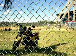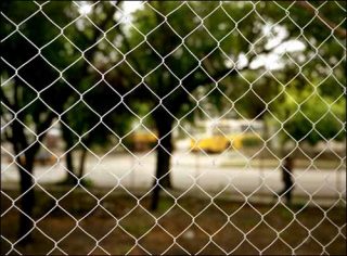 Au premier plan, recouvrant tout le cadre, un grillage, net, pixellise l’arrière plan qui, lui, est flou: à peine distingue-t-on des arbres, une maison, un terrain de jeux. Le sujet, mis à distance, passe à proprement parler au second plan.