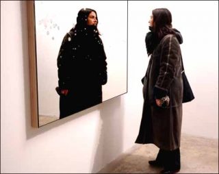 — Miroirs, 2002-2003. 3 miroirs, bois, sperme.150 x 150 x 6,5 cm.