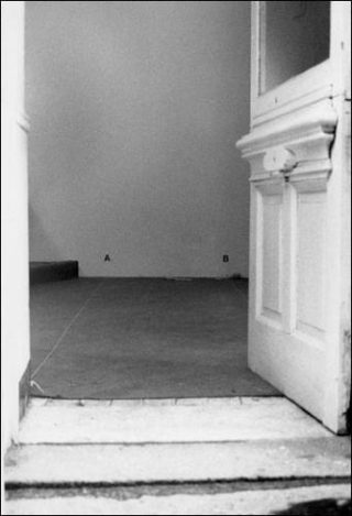 1. Une reconstitution de la première apparition de l’œuvre en 1978 au Mixage International à Caen, dispositif constitué de plusieurs éléments: deux couples de lettres A et B matérialisées en letraset de vinyle noir renvoyant aux lettres inscrites sur le carton d’invitation également présenté.