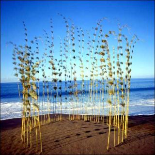 L’atmosphère change, pourtant, dans les trois photographies prises en mer Baltique où Nils-Udo a semé mille narcisses en une magie aquatique. Tout est ondes claires dans ce triptyque d’étendues marines : la première parcourue d’un long méandre safrané, la deuxième entourant une île plantée de mille narcisses, et la troisième étalant limpidité et transparence des flots illuminés par un soleil diffus. L’artiste fait vibrer la nature métamorphosée de sa vision personnelle.