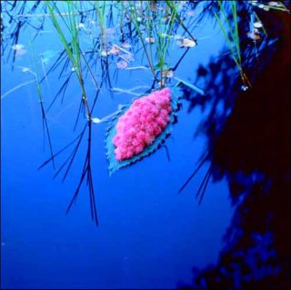 Si ces plantes hybrides parviennent à sublimer les sites, c’est que Nils-Udo les place dans des refuges mystérieux et des mares ou résurgences solitaires que de sombres ramures enténèbrent. Cinq des dix photographies exposées présentent des eaux dormantes, opaques, emplies d’ombres où se mêlent les reflets de branchages et de racines, et qui sont propices à la disparition de quelque Ophélie. Ces lieux intimes nous transposent dans un monde onirique, incitent à la rêverie et invitent à la contemplation : le silence sourd de ses photographies.