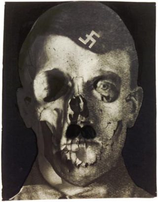 Ainsi, Erwin Blumenfeld emploie aussi son savoir-faire photographique pour dénoncer les barbaries fasciste et nazie. Dès 1933 et l’accession d’Hitler au pouvoir, Erwin Blumenfeld entreprend une série détonante intitulée Le Dictateur. Tout comme Chaplin avait déjà adopté ce titre pour l’un de ses plus célèbres films où il tournait en dérision la personne du Führer, Erwin Blumenfeld ridiculise le visage d’Hitler, notamment lorsqu’il le remplace par une tête de veau mort (The Minotaur or The Dictator). Mais surtout, il met en place un vocabulaire plastique sanglant et morbide, matérialisant la soif de destruction du parti nazi: en usant du photomontage et de collages, il superpose le négatif d’un crâne de mort sur le visage d’Hitler, ou applique des larmes de sang sur les joues du Führer.
