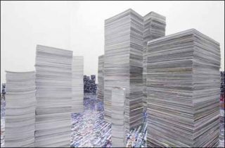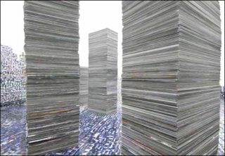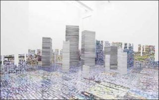 Sur les murs sont esquissées des silhouettes de buildings, et au centre de l’espace sont disposées des piles de photos de différentes hauteurs figurant elles aussi des buildings. On pénètre ainsi à l’entrée de la galerie dans un modèle réduit de ville. Les photographies avec lesquelles est construit ce modèle réduit sont invisibles en elles-mêmes, seule leur accumulation est visible. Prises individuellement, elles ne réclament aucune attention, une image en vaut une autre et n’est que l’infime partie d’un tout. D’ailleurs les spectateurs piétinent les photos disposées sur le sol.