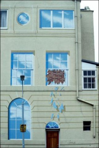 Le trompe-l’œil serait ainsi une pratique mystificatrice mue par une volonté d’abuser le spectateur. Elle travaille en ce sens: créer des effets d’«hyperréalité» afin de nous faire adhérer à ce qu’elle représente, et de le prendre ainsi pour vrai. A ce sujet, l’un des exemples les plus éloquents parmi les clichés de Cuchi White, demeure Près de la gare du Nord. Le trompe-l’œil y représente en effet une façade de maison ornementée de petits détails, détails qui nous poussent à croire que cette maison est justement habitée: la porte d’entrée est entrouverte et un petit chat se trouve sur le seuil, comme s’il s’était faufilé par celle-ci. Et les rideaux de la fenêtre, quant à eux, sont en partie tirés, afin que la dame représentée puisse y passer la tête. L’enjeu du trompe-l’œil est alors de créer l’impression d’une apparente réalité spatiale.