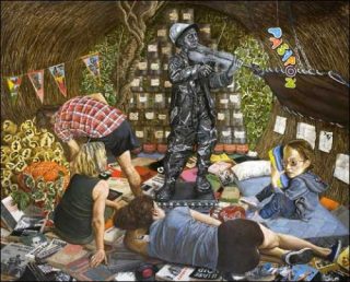 Une vision dichotomique manifeste dans l’œuvre de Marcos Carrasquer (né en 1959) qui excelle dans l’art du détail. A la manière de Brueghel, ses compositions fourmillent de motifs et d’éléments. A la manière de Bosch, les échelles varient et la lecture de l’image s’épaissit. Il y règne un chaos, un drame, une confusion. Les êtres sont comme fous, perdus dans leurs activités absurdes. Les motifs, les objets et surtout les corps participent à la reconstitution d’une histoire personnelle. Qu’elle soit dérangeante ou transgressive, sa peinture fascine par sa dimension troublante.