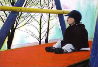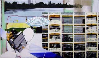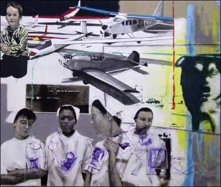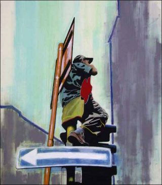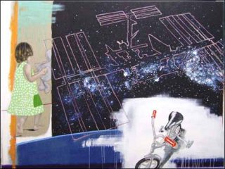 Les toiles qui nous sont présentées, de grand ou moyen format, nous offrent des panoramas hétéroclites où se rencontrent, d’œuvre en œuvre, quelques motifs récurrents, tels des enfants, un motard, la silhouette d’un satellite. Ces images coexistent sur le mode de l’entrechoc, de la superposition, ou bien de l’indifférence.
