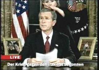 On voit dans celle-ci, Shock and Awe [Choc et effroi], sur grand écran dans une salle plongée dans le noir, George Bush dans les minutes précédant son annonce de déclaration de guerre à l’Irak alors qu’il passe en direct sur Euronews sans le savoir — multipliant tics, gestes de connivence ou de prière, regards en coin et mimiques, tandis qu’on le coiffe et maquille.
