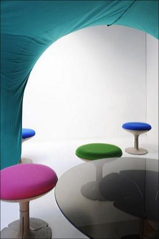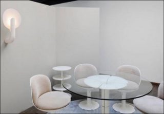 La qualité muséale des Å“uvres présentées est ici certaine. Que l’on en juge avec l’exceptionnel tapis-siège, la Déclive, une structure formée de lattes articulées en aluminium, avec gainage de mousse et textile, l’ensemble de la pièce se mouvant sous l’action d’une seule clef. Seuls deux exemplaires sont connus, celui ci et un deuxième conservé depuis 2003 au Centre Georges Pompidou. Autre gage de qualité, en 1970 déjà , Monsieur et Madame Pompidou, alors résidents du Palais de l’Elysée, avaient choisi Pierre Paulin, pour y réaménager une salle à manger, un salon-fumoir et une bibliothèque. A la condition de la réversibilité du décor… S’en est suivie une édition limitée dite Elysée de guéridons, tabourets, tables, chaises, en fonte laquée et à piètement en trèfle, ainsi que des luminaires. On peut voir certains de ses éléments exposés à la galerie, et avoir ainsi une idée de l’ambiance créée par ce décor. Le clou du spectacle étant peut-être la table basse Rosace en plexiglas et plateau de verre fumé, dont l’exemplaire présidentiel était lumineux.