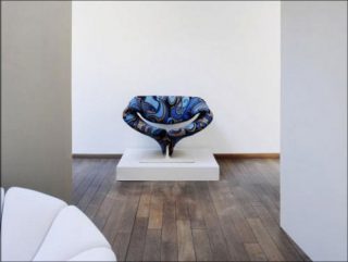 Pierre Paulin a surtout apporté une nouvelle vision de l’assise, une réforme du siège, en mettant en place des structures métalliques accueillant de la mousse polyester, recouverte d’un jersey élastique. Cette technique, astucieusement empruntée aux maillots de bain, enveloppe la pièce telle une chaussette, éliminant tout pli disgracieux, faisant ainsi disparaitre progressivement le piètement. Ainsi, les deux fauteuils Croissants exposés dans la galerie, ou encore le grand canapé Multimo, dont les dossiers s’évasent en pétales de fleur. Mais son tour de force restera surement le Ribbon Chair, un anneau courbé mis en forme, et revêtu des tissus psychédéliques de Jack Lenor Larsen. Ce fauteuil édité en 1966, est entré dès la même année dans les collections du MOMA de New York. On regrettera seulement la disposition trop frontale de cette pièce dans l’espace de la galerie, tant on voudrait tourner autour, l’étudier sous toutes ses coutures. L’éditeur hollandais Artifort, pour qui le designer conçoit tous ces sièges, s’adresse aussi aux collectivités, comme avec le canapé combinable C262, dit l’ABC, décliné en 2,3, 4 ou 5 places.