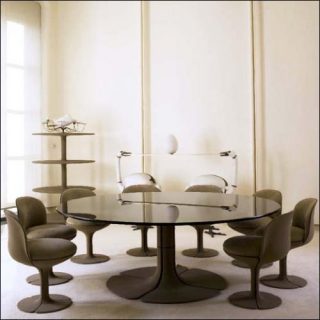 Le mobilier est un vecteur symbolique du pouvoir. Pour l’Élysée, Pierre Paulin crée alors un univers clos, protégé et apaisant, et imagine un mobilier alliant rigueur et avant-gardisme. De ce mobilier, la galerie Jousse Entreprise présente plusieurs pièces à l’instar des appliques et du lampadaire grand modèle édités par Verre Lumière et de l’ensemble de fauteuils et canapé «Coussins», édité par Alpha International et Mangau, toujours sous la tutelle du Mobilier National.