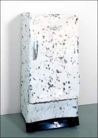 — Stoning the Refrigerator, 1996. Performance au Fonds Régional d’Art Contemporain Champagne-Ardenne