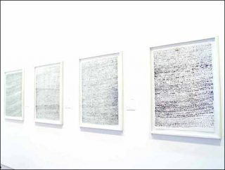 Depuis les années 1960, imperturbablement, l’artiste aligne des petites touches d’encre noire sur des feuilles blanches qu’elle a posé au sol, à l’aide d’une plume ou d’un pinceau. Bien qu’elle ait aussi réalisé dans les années 1980 des travaux à partir de fils de crin noués ou agrégés en trames complexes, elle n’interrompt jamais cette pratique du dessin qui demeure privilégiée.