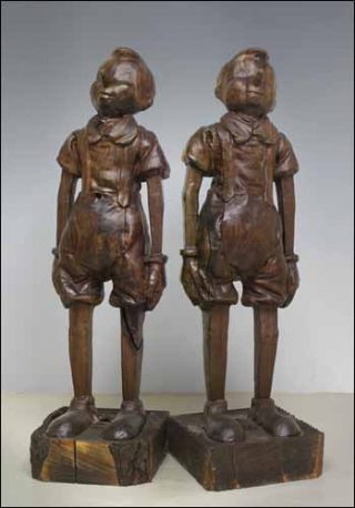 Ce sont tout d’abord les sculptures qui attirent l’attention: elles sont toutes exclusivement en bois et semblent rejouer la nature même du corps de Pinocchio, être hybride entre marionnette et jeune garçon. Les sculptures sont rigides, hiératiques, statiques et présentent le petit héros dans de nombreuses postures, qui sont autant d’étapes de son aventure, à l’exemple de celle intitulée Two Thieves, One Liar, où Pinocchio est pris avec les deux voleurs, un renard et une sorte de gros chat féroce.