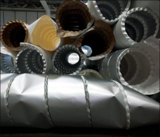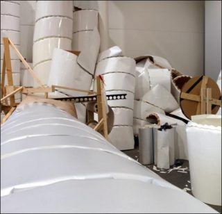 De par sa monumentalité, elle bouleverse la perception de l’espace malgré son évidente fragilité. Le papier Tetrapâck (emballage des boîtes de lait), matériau vedette de cette exposition, envahit le lieu où, espace d’exposition / espace de travail / ateliers se confondent.