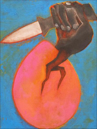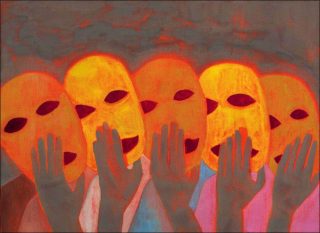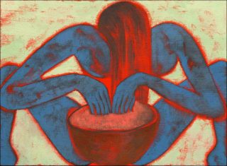 Dans un équilibre toujours harmonieux de couleurs et de formes se dessine la pluralité, la profondeur et la puissance du sentiment amoureux. La démarche de Francesco Clemente prend parfois la forme d’un simple hommage : le tableau For Her dresse le portrait d’une femme assise devant un large récipient dans lequel elle plonge ses mains, le visage entièrement masqué par sa chevelure qui tombe devant. Ce rare exemple de restitution d’une scène côtoie des motifs toujours figuratifs mais plus volontiers symboliques. La toile You and Me aligne cinq personnages appliquant chacun avec leur main gauche un masque orangé sur leur visage, dans celle intitulée Open Secret, une main grise jaillissant de ce qui ressemble à une goutte rose qu’elle a brisée comme une coquille d’œuf brandit un poignard.