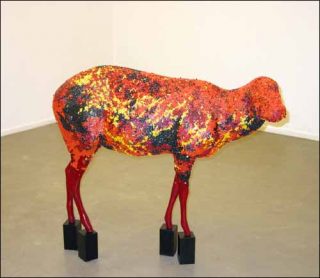 Dès l’entrée, le regard est comme happé vers le fond de la pièce par Le Baiser de Mars de Myriam Mechita. Un étrange moulage d’antilope recouvert de quelques 30 000 perles de rocaille. Les masses rouge, jaune, orange et gris clair pourraient faire croire à une bête écorchée. Pourtant, ces dessins n’ont rien d’anatomique, ils figurent sur le corps de l’animal une image de résonance magnétique de la planète mars. De là naît la fascination. Au-delà du travail d’orfèvre qu’a demandé l’ornementation du corps, la métamorphose de cette belle antilope nous fait voyager dans l’étrange, le territoire fantasmé de la planète mars.