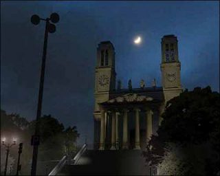 Chacune des parties de l’installation-vidéo en forme de triptyque correspond à un côté de la place, de sorte que le spectateur se trouve immergé dans cet espace virtuel. De vrai-faux passants foulent les trottoirs et passent devant un objectif fictif. Des devantures de boutiques, des terrasses de cafés désertées, un banc public, un jardin d’enfant vide… Les nuages défilent et un avion trace une ligne blanche évanescente dans le ciel, un feu passe du vert au rouge. La nuit tombe, une lune baigne la place de ses lueurs. Persiste la rumeur de la circulation automobile, quasi incessante. L’effet de réel est à peine troublé par quelques traces résiduelles de manipulations informatiques qui viennent volontairement trahir le caractère factice de l’image.