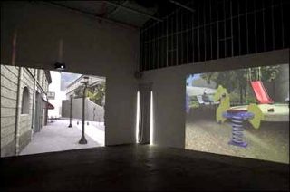 — Place Franz Liszt, 2006. Installation : film d’animation, 3 projections murales, maquettes, dessins.