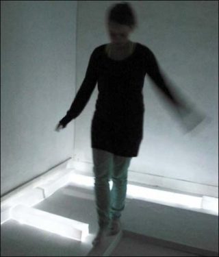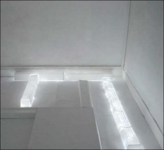 En écho à la solidité de la roche, à la légèreté du sable et à la transparence de l’eau, certains volumes sont pleins, rigides et opaques, d’autres sont creux, souples, et laissent émerger de la lumière. Des fragments de textes apparaissent et peuvent être lus selon plusieurs axes. Ces voies multiples pour accéder au sens du texte renvoient au labyrinthe en rhizome, qui fait coïncider plusieurs chemins. L’espace entièrement blanc laisse place au son des pas sur le papier, à la sonorités des mots – qu’ils soient prononcés à haute voix ou lus intérieurement – et ouvre ainsi une plage sonore.
