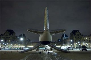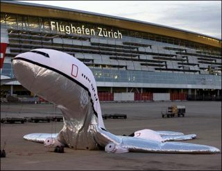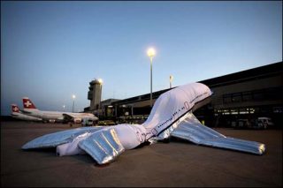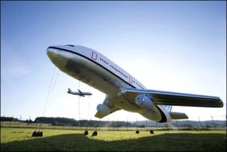 Pourquoi un avion gonflable ? Aleksandra Mir relate la stupéfiante impression d’immobilité qu’avaient les avions à l’atterrissage observés depuis la fenêtre d’un train en direction de Bristol. Reproduire cette image fut alors un «caprice» sur lequel se sont penchés huit ingénieurs pendant plusieurs mois.