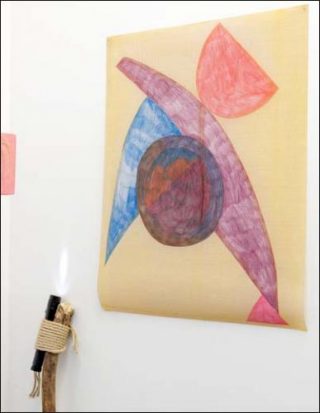 Son installation Planetaria réunit dans l’angle de la galerie — rappelant d’ailleurs la façon de placer les icônes — un ensemble d’éléments renvoyant à des outils et un dessin de sa cartographie imaginaire. S’agirait-il de nous propulser dans un laboratoire primitif avec les instruments d’un alchimiste ou d’un médium? Dans le noir de la connaissance, il faudra se munir d’une lampe torche que l’artiste attache avec une corde à un bâton en bois, semblant évoquer que l’expérimentation scientifique (y compris la plus développée) se déclenche souvent par les outils d’un artisan.