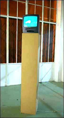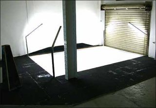 L’installation de Nicolas Dusollier (Sans titre, combat) soulève de nombreuses interrogations. Une sorte de ring creux, sur lequel une fine membrane plastique blanchâtre est tendue est balayé par un vent venant d’en dessous: la bâche ondule et résiste de justesse à la force de l’air. Cet espace de tension perpétuelle est délimité par un sol de quartz noir rugueux, d’une froide et énigmatique poésie. Des néons crus éclairent par en dessous et par en dessus cette espace où aucun combat n’est possible, excepté peut-être celui des interprétations…