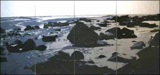 Vus de loin, les quatre grands panneaux d’Arnauld Colcomb évoquent les formes d’un paysage marin, à marée basse, sous un ciel gris. Mais vus de plus près, l’œuvre apparaît composée de sacs poubelles collés sur des plaques d’aluminium. Cette représentation de paysages de mer faits de sacs plastiques veut-elle désigner l’avenir du littoral?