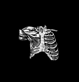 Raphaël Boccanfuso s’adonnerait donc désormais à une passion populaire : la carte à gratter. Inventée au XIXe siècle, cette technique — qui consiste à intailler une surface pour en faire apparaître la couleur de la sous-couche, noire ou blanche — se rencontre presque exclusivement dans les activités de loisirs, outils artistiques de prédilection des enfants et des amateurs, ou chez les illustrateurs. Sa parenté avec la gravure, et sa rareté d’utilisation par les artistes, en fait un médium scolaire et désuet, un tantinet obsolète — idéal, nous semble t-il, pour endosser les emblèmes anatomiques de l’artiste : viscères, os, têtes de mort et autres monogrammes d’essence organique.