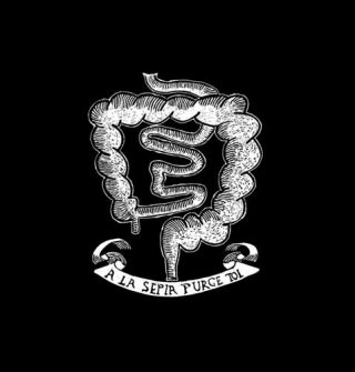 Il est tentant de voir dans ces boyaux et encéphales les fragments du corps social, exposés dans toute leur vérité d’écorchés, désacralisés à grand renfort de devises digestives ou blasphématoires comme dans Rends Dieu et ton quatre heures. Le motif de Dénerve moi, copie parfaite d’un écusson médiéval, évoque formellement (et explicitement cette fois) l’armoirie, marque évidente d’autorité et de positionnement social.