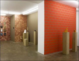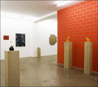 L’exposition s’ouvre sur un simili mur de brique, autocollant géant figure du trompe l’œil ou du psychédélisme, ou encore de la peinture post-moderne ; puis, les formes géométriques simples dominent dans un joyeux mélange des genres, entre exercices d’école et référence à l’art minimal.