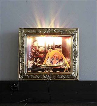 Floréal a disposé sur les plinthes des murs six tableaux kitsch, dont un plus grand. On retrouve le même collage numérique en couleurs, format carte postale, éclairé par un fragile système électrique: une petite Artémis manga surgit de la reproduction de La Vierge au chancelier Rolin, la célèbre peinture de Van Eyck.