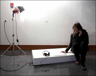 Arlène Berceliot, Please Follow Me, 2006. 1 min en boucle. Mini-disque et écouteurs ; projecteur ; socle bois peint blanc. 80 x 128 x15 cm.