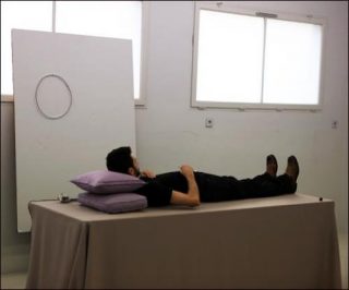 Jean-Baptiste Caron. Je mélange ici ma passion pour la prestidigitation et l’utilise. Je récupère plusieurs poussières de nombril, j’en forme une boule qui s’écrase au sol, elle ne rebondit pas… J’essaye plusieurs fois… ça ne fonctionne pas donc je la pose. Je m’allonge ensuite sur la table, je frotte la poussière de mon nombril et elle commence à léviter. Enfin je reprends la boule et à ce moment en la faisant tomber elle rebondit, il y a une transformation d’état de la matière entre pesanteur et impesanteur.