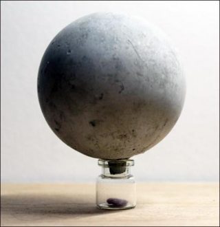 Contrepoids inverse l’essence de ces deux notions. La poussière reste ancrée au fond du bocal tandis que la sphère de béton se fait bouchon ou ballon de montgolfière. Dans Genèse la poussière se retrouve au centre d’une planète miniature qui nous transporte métaphoriquement dans un monde étrange.
