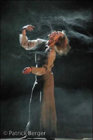 Lorsque Philippe Adrien prend la parole, dans une pénombre onirique, narrant à la première personne la vie et l’engagement de l’écrivain, la silhouette s’anime depuis le fond de la scène, se découpant à contre-jour sur un écran. Ombre d’un poète devenu ombre, Simon Bellouard retrace par gestes les combats qui ponctuent la vie d’un homme, lui redonnant un corps tandis que le lecteur lui redonne une voix. Voix d’un homme…à laquelle succède bientôt la voix d’un poète, ou plutôt la voix d’une âme poétique. Passage de la biographie aux poèmes, marqué par l’entrée en scène, dans un faisceau lumineux mordoré, de Carolyn Carlson, tandis que Kudsi Erguner fait vibrer dans les airs les premiers accents de sa flûte ottomane.