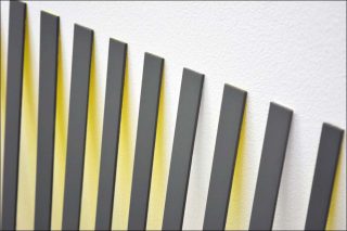 Avec l’installation Surface en blanc et jaune #2, la lumière est utilisée comme ultime moyen d’estomper la coupure entre la surface du mur et celle de l’œuvre. Une série de minces bandes d’acier couvertes de peinture aérosol grise sont alignées contre un mur blanc, de façon inclinée. Une lumière jaune qui émane de l’arrière de chacune d’elles en prolonge la forme sur le mur. Par le biais de cette projection colorée, la bordure de l’œuvre n’est plus un espace fini mais transitoire.
