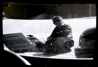 Misère et solitude encore dans la vidéo de Roy Arden. Au milieu d’un flot de voitures un jeune homme attend. Sans domicile. Un manège infernal l’entoure, l’encercle, dans un mouvement perpétuel. En boucle tourne la bande vidéo, le son en continu rajoute à cet enfermement. Roy Arden filme de sa voiture, et tourne lui aussi en même temps que tourne le film, et tourne la Terre. De lui la voiture nous isole, les optiques de la caméra, l’écran du moniteur…