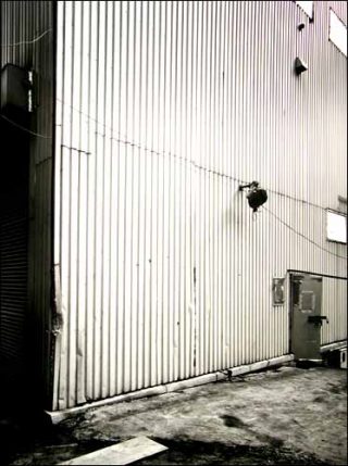 Les grandes photographies noires et blanches de Ruyji Miyamoto nous conduisent derrière des usines ou des entrepôts, lieux entropiques par excellence où rien ne semble pouvoir se passer, si n’était la présence troublante de projecteurs et de caméras de surveillance vidéo. Les tuyaux exhibant leur grisaille défaite n’ont pas ici valeur de monument, de sculptures industrielles, que les Becher confèrent aux hauts fourneaux qu’ils photographient.