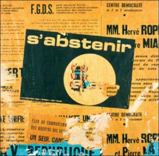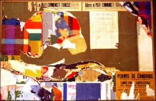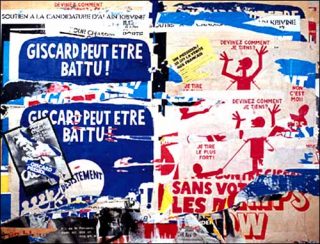 Outil essentiel de propagande, l’affiche politique n’est-elle pas la plus apte à soulever les passions du «Lacéré Anonyme»? Inventé par Villeglé, cet artiste fictif personnalise l’ensemble des interventions réalisées sur les affiches par des individus anonymes. A la suite de déchirures successives et d’arrachages sauvages, le slogan politique côtoie la réclame, les noms et visages de leader politiques apparaissent, tronqués par des mains rageuses. Au message imprimé se mêlent également les revendications écrites.